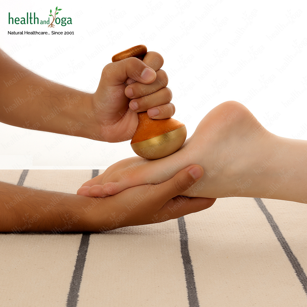 Kansa Vatki Massage (Padabhyanga) - Ayurvedic ritual practised for ages to treat various ailments. Feet have nerve endings of the internal organs, so any stimulation or massage on the feet, directly affects the internal body. Vatki Foot Massage is done by applying oil on the feet and by doing circular motions with the Vatki.