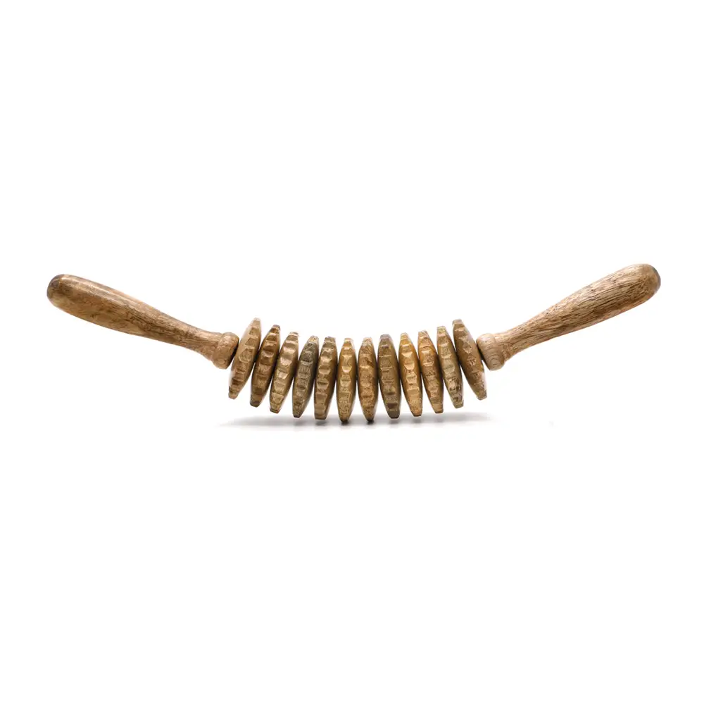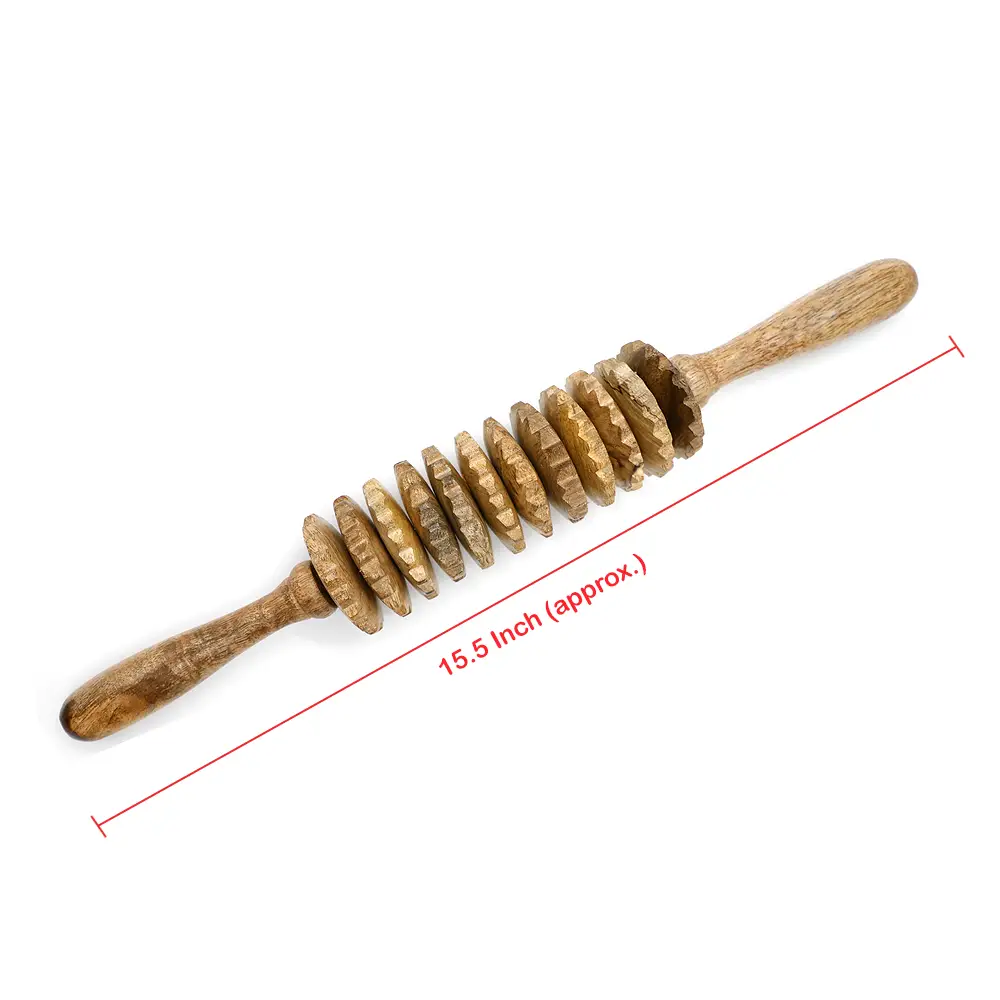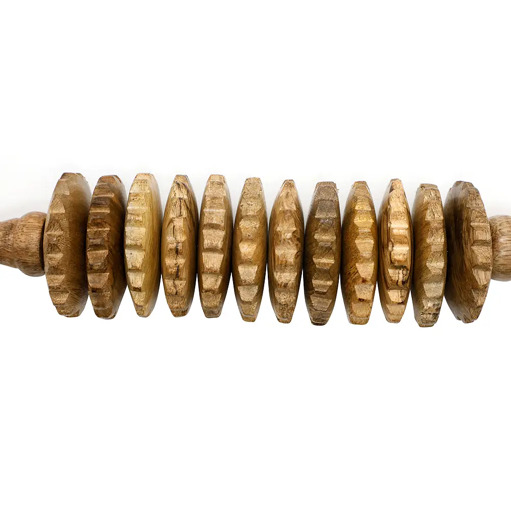 This organic and robust anti-cellulite roller massage stick is made from 100% natural and chemical-free wood. While being flexible, It is durable and withstands pressure as an effective and best massage tool for long term use. It is biodegradable and thus keeps the environment safe. Being skin-friendly, this manual roller is the best well-being therapy based tool. This wooden massager has been strategically designed for tissue massage. There are twelve gear-shaped rollers of 0.5 inches each and are finely trimmed to get carved pointed that hit pressure points. All the rollers are joined with a robust connecting wire.