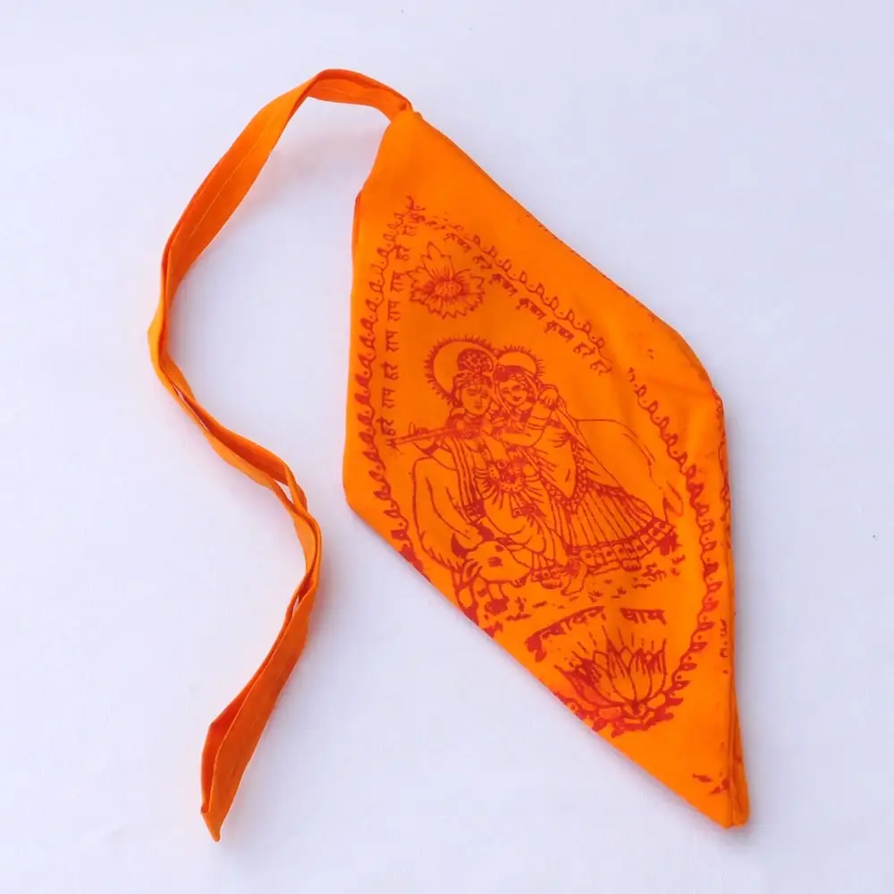 This Saffron colored bag has a printed image of Radha-Krishna. It is made of pure cotton allowing the hand to remain comfortable and letting the skin breathe during Japa. These beautiful bags are tear-drop-shaped, with a large hole to insert your hand and a small one for your index finger. It also has a long thin cotton strap for carrying the bag around your neck, wrapping it around the wrist, or for hanging it so it does not fall on or touch the floor.